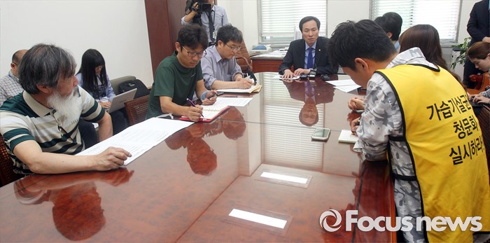 (서울=포커스뉴스) 우상호 더불어민주당 원내대표가 31일 오전 서울 여의도 국회에서 가습기 살균제 피해자 가족과 면담을 하고 있다.