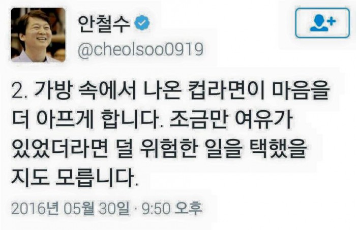 안 대표는 지난 30일 밤 "가방 속에서 나온 컵라면이 마음을 더 아프게 한다"며 "(희생자가) 조금만 여유가 있었더라면 덜 위험한 일을 택했을지도 모른다"고 애도했다.