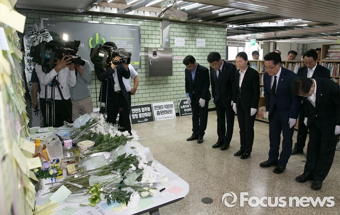 (서울=포커스뉴스) 박지원(오른쪽 두번째) 국민의당 원내대표 등 의원들이 31일 오후 서울 광진구 지하철 구의역 역사 내에 마련된 스크린도어 정비 작업 중 사고로 숨진 김모(19) 씨의 추모공간을 방문해 헌화 및 묵념을 하고 있다.