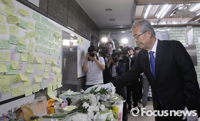 (서울=포커스뉴스) 김종인 더불어민주당 비대위 대표와 을지로위원회 소속 의원들이 31일 오후 서울 광진구 지하철 구의역 역사 내에 마련된 스크린도어 정비 작업 중 사고로 숨진 김모(19) 씨의 추모공간을 방문해 헌화를 하고 있다.