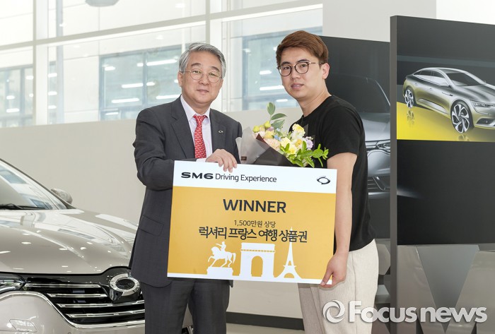(서울=포커스뉴스) 르노삼성자동차는 31일 'SM6 드라이빙 익스피리언스' 전국 시승행사의 최종 당첨자로 경기도 성남시에 거주하는 최준모(34)씨를 선정하고, 서울 가산동 사옥에서 1500만원 상당의 프랑스 여행상품권을 전달했다.