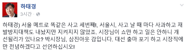 하 의원은 이날 오후 자신의 페이스북을 통해 지난 28일 발생한 구의역 스크린도어 사고를 언급하며 이같이 주장했다.