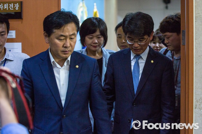(서울=포커스뉴스) 야3당 원내수석부대표들이 31일 오후 서울 여의도 국회에서 가습기 살균제 사건, 세월호특별법 제정, 어버이연합 게이트 등 현안 공조 관련 브리핑을 마친 뒤 기자회견장을 나서고 있다. 왼쪽부터 김관영 국민의당 원내수석부대표, 이정미 정의당 원내수석부대표, 박완주 더불어민주당 원내수석부대표.