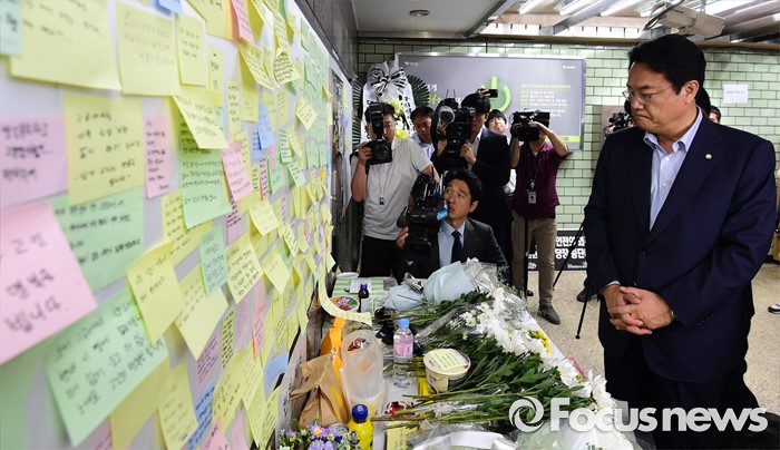 (서울=포커스뉴스) 정진석 새누리당 원내대표가 31일 오후 서울 광진구 지하철 구의역에서 스크린도어 정비 작업 중 사고로 숨진 김모(19) 씨의 추모공간을 방문해 고인을 추모하고 있다.