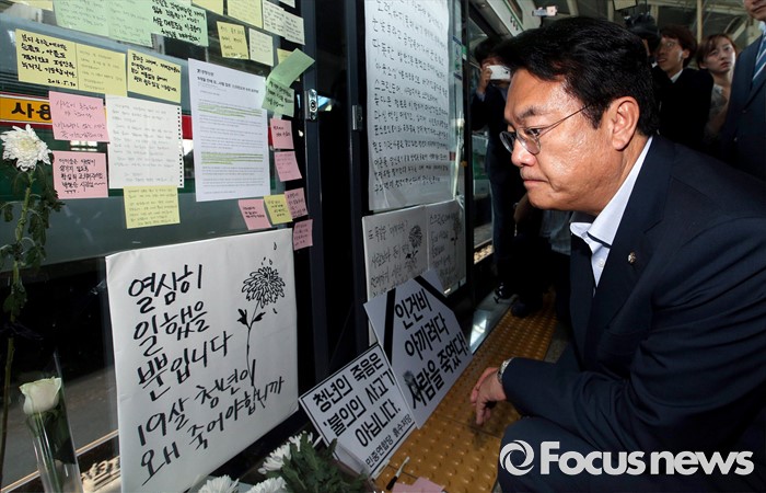 (서울=포커스뉴스) 정진석 새누리당 원내대표가 31일 오후 서울 광진구 지하철 구의역에서 스크린도어 정비 작업 중 사고로 숨진 김모(19) 씨의 사건장소를 방문해 고인을 추모하고 있다.