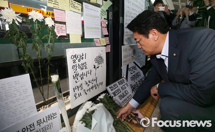 구의역 스크린도어 사고현장 찾아 추모하는 정진석