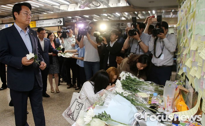 (서울=포커스뉴스) 정진석 새누리당 원내대표 등 의원들이 31일 오후 서울 광진구 지하철 구의역에서 스크린도어 정비 작업 중 사고로 숨진 김모(19) 씨의 추모공간을 방문해 고인을 추모하고 있다.