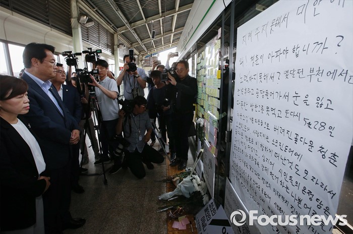 (서울=포커스뉴스) 정진석 새누리당 원내대표가 31일 오후 서울 광진구 지하철 구의역에서 스크린도어 정비 작업 중 사고로 숨진 김모(19) 씨의 사건장소를 방문해 고인을 추모하고 있다.