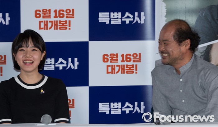 (서울=포커스뉴스) 31일 오후 서울 성동구 왕십리 CGV에서 열린 영화 ' 특별수사 : 사형수의 편지' 언론시사회에 참석한 배우 김향기(왼쪽)과 김상호가 미소를 짓고 있다.