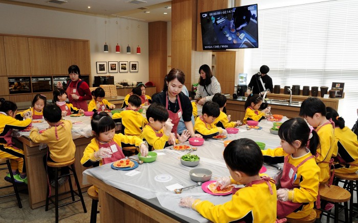 뮤지엄김치간 관계자는 "젓갈이 들어가 김치 먹는 것을 꺼리는 채식주의자들에게 안심하고 즐길 수 있는 채식김치가 있다는 것을 알리기 위해 이번 이벤트를 준비했다"며 "젓갈 향 때문에 평소 김치를 꺼리는 분이나 김치를 처음 접하는 외국인들도 채식김치로 김치와 친숙해지는 계기가 되길 바란다"고 말했다.뮤지엄김치간을 단체 방문한 어린이들이 '김치피자 만들기' 체험에 참여하고 있다.<사진제공=풀무원>