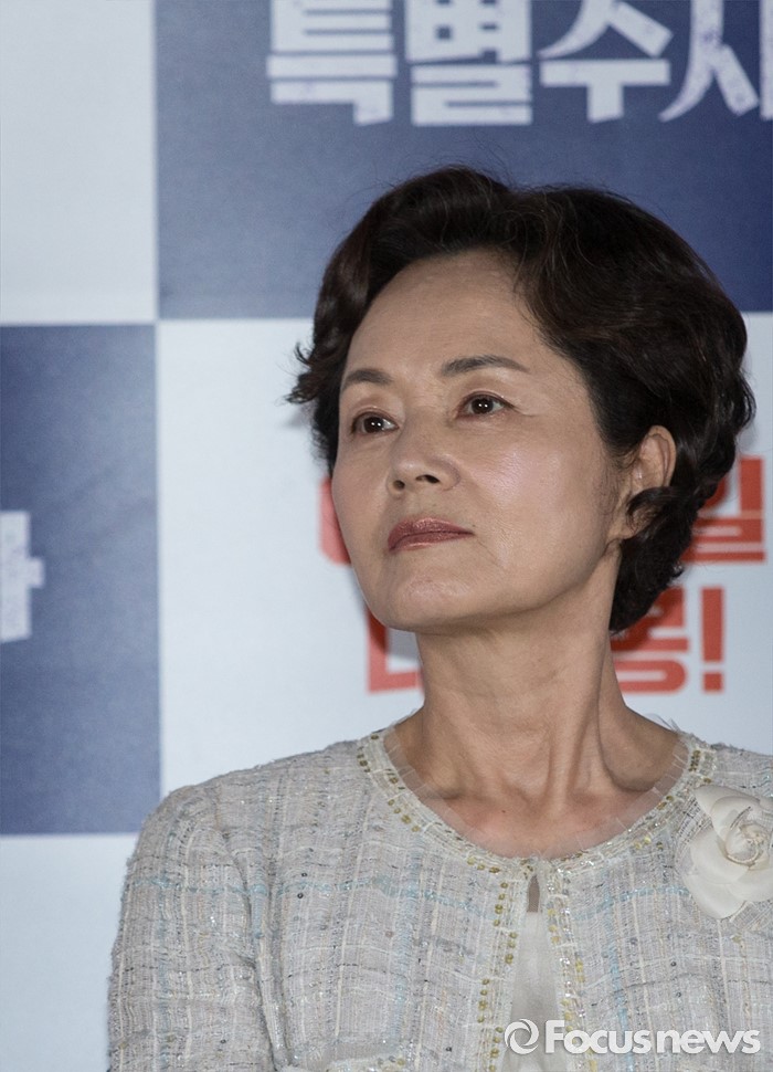 (서울=포커스뉴스) 31일 오후 서울 성동구 왕십리 CGV에서 열린 영화 ' 특별수사 : 사형수의 편지' 언론시사회에 참석한 배우 김영애가 취재진에게 질문을 받고 있다.