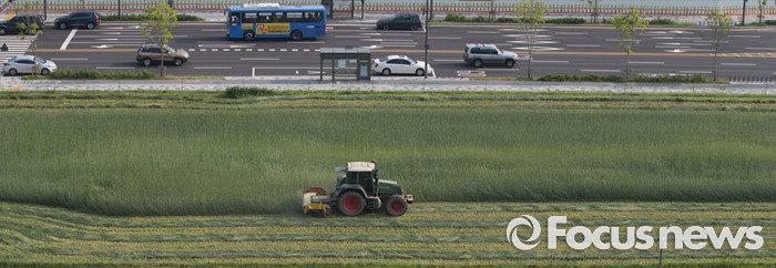 (세종=포커스뉴스) 31일 오후 세종시 정부세종청사 인근 한국토지주택공사 부지에 심은 호밀을 수확하고 있다.