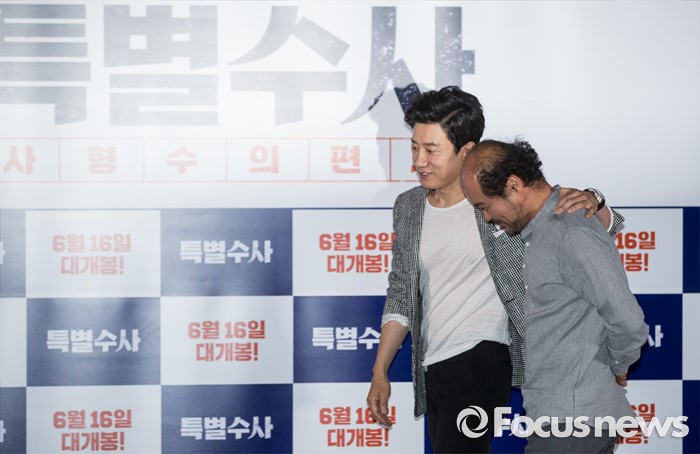 (서울=포커스뉴스) 31일 오후 서울 성동구 왕십리 CGV에서 열린 영화 ' 특별수사 : 사형수의 편지' 언론시사회에 참석한 배우 김명민(왼쪽)과 김상호가 포토타임을 갖고 있다.