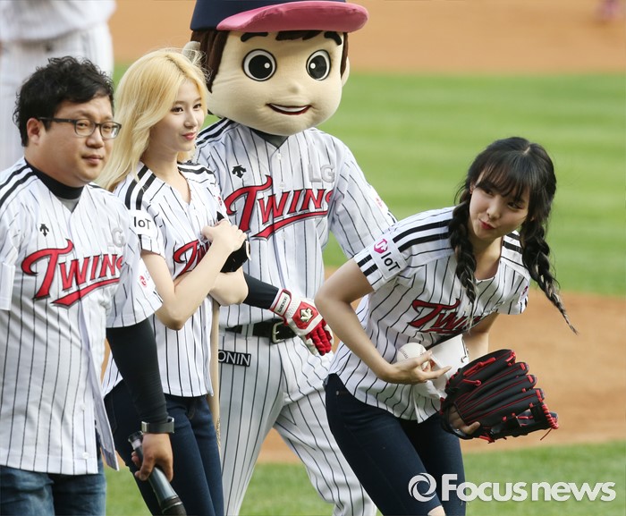 (서울=포커스뉴스) 31일 서울 잠실구장에서 열린 2016 프로야구 KIA-LG 경기에 앞서 걸그룹 트와이스의 나연(오른쪽)과 사나가 시구 시타를 마치고 관중에게 인사하고 있다.