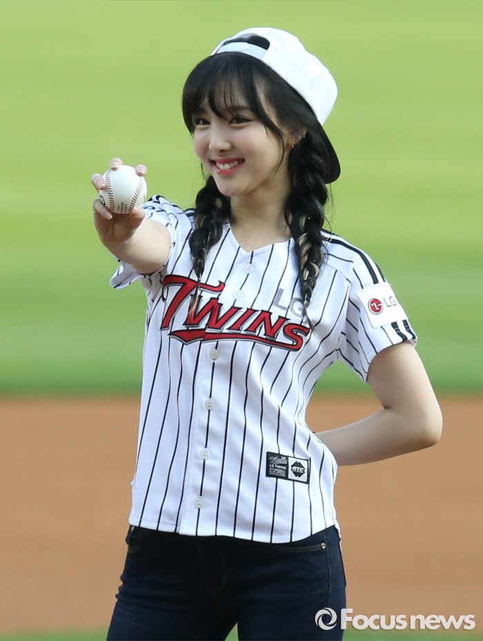(서울=포커스뉴스) 31일 서울 잠실구장에서 열린 2016 프로야구 KIA-LG 경기에 앞서 시구자로 나온 걸그룹 트와이스의 나연이 공을 들어 보이고 있다.