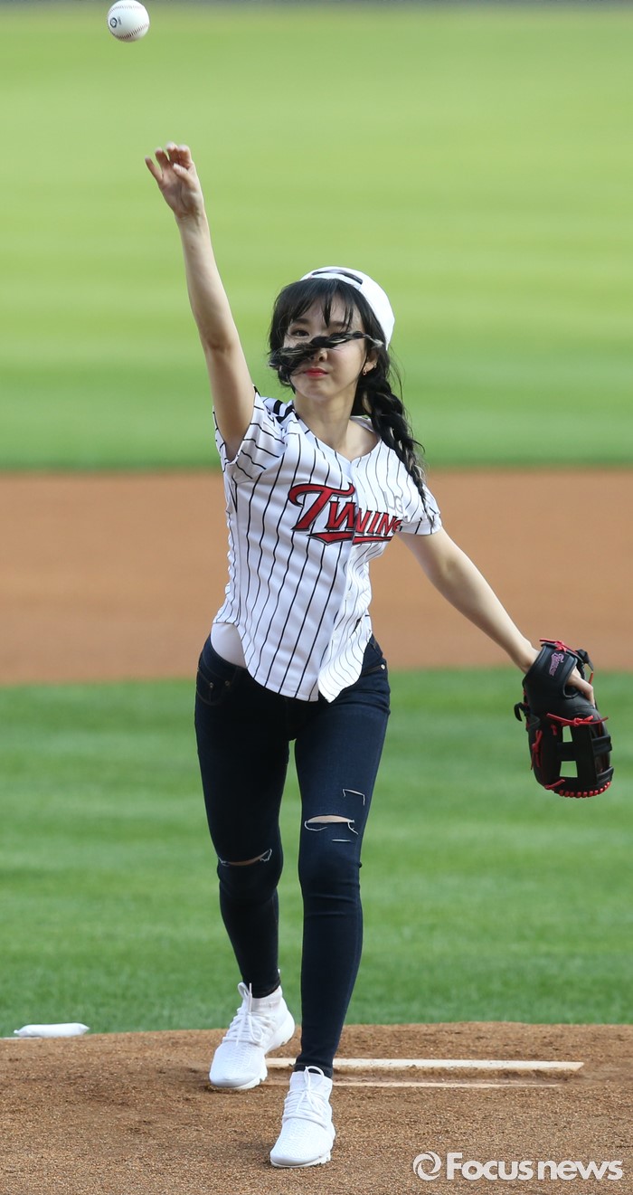 (서울=포커스뉴스) 31일 서울 잠실구장에서 열린 2016 프로야구 KIA-LG 경기에 앞서 걸그룹 트와이스의 나연이 시구하고 있다.