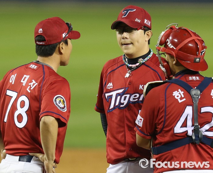 (서울=포커스뉴스) 31일 서울 잠실구장에서 열린 2016 프로야구 KIA-LG 경기 4회말 1사 1,2루에서 KIA 이대진 코치가 마운드에 올라가 투수 양현종을 안정시키고 있다.