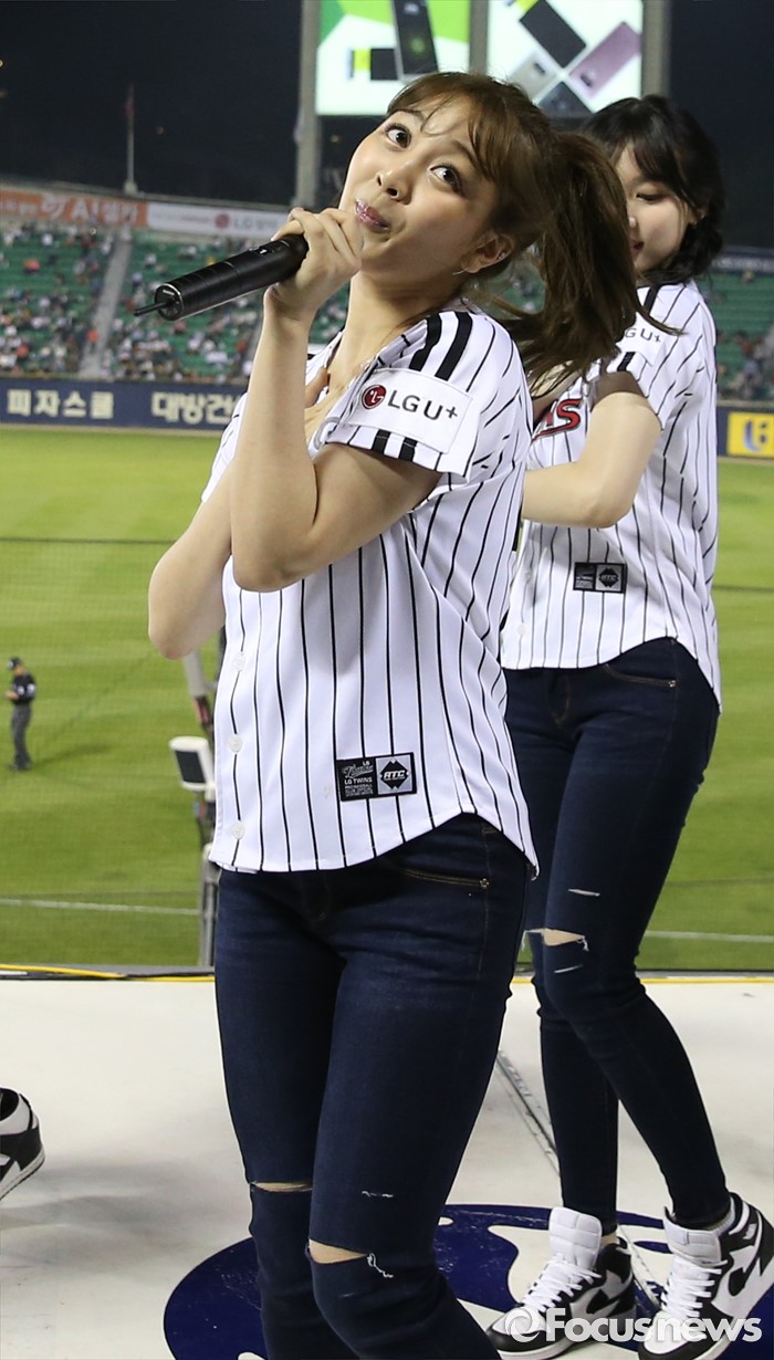(서울=포커스뉴스) 31일 서울 잠실구장에서 열린 2016 프로야구 KIA-LG 경기에 인기 걸그룹 트와이스가 시구, 시타로 참여한뒤 경기 중간 응원단상에 올라 관중에게 노래와 춤을 선사하고 있다.