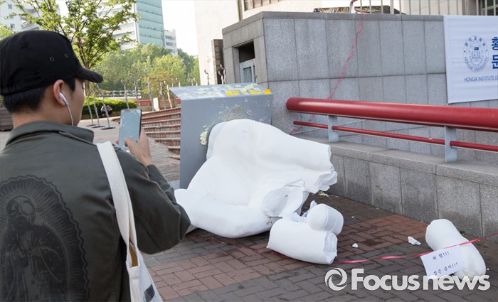 (서울=포커스뉴스) 1일 오전 서울 마포구 홍익대학교 정문에 설치된 극우성향 사이트 '일베' 상징물 조각상 파손된 채 길에 방치돼 있다. 조각상은 일간베스트저장소를 상징하는 자음 'ㅇ'과 'ㅂ' 모양을 하며 회원을 인증하는 손 모양이다. '어디에나 있고, 아무데도 없다'는 제목의 이 조각상은 조소과 4학년 홍기하씨가 '환경조각연구' 수업 과제로 제작해 야외조각전에 출품한 것이다.