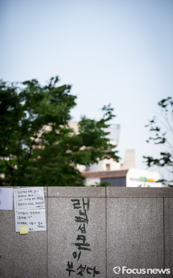 (서울=포커스뉴스) 1일 오전 서울 마포구 홍익대학교 정문에 설치된 극우성향 사이트 '일베' 상징물 조각상이 파손된 가운데 조소상이 있던 자리가 텅 비어있다. 조각상은 일간베스트저장소를 상징하는 자음 'ㅇ'과 'ㅂ' 모양을 하며 회원을 인증하는 손 모양이다. '어디에나 있고, 아무데도 없다'는 제목의 이 조각상은 조소과 4학년 홍기하씨가 '환경조각연구' 수업 과제로 제작해 야외조각전에 출품한 것이다.