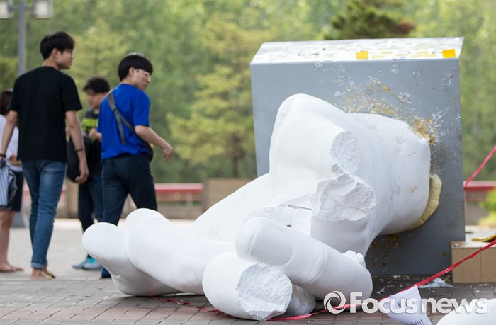 (서울=포커스뉴스) 1일 오전 서울 마포구 홍익대학교 정문에 설치된 극우성향 사이트 '일베' 상징물 조각상 파손된 채 길에 방치돼 있다. 조각상은 일간베스트저장소를 상징하는 자음 'ㅇ'과 'ㅂ' 모양을 하며 회원을 인증하는 손 모양이다. '어디에나 있고, 아무데도 없다'는 제목의 이 조각상은 조소과 4학년 홍기하씨가 '환경조각연구' 수업 과제로 제작해 야외조각전에 출품한 것이다.