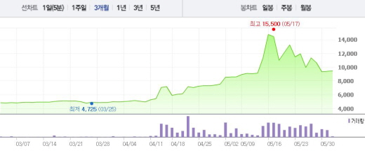 이는 2달 전 주가인 4월1일(4975원)과 비교했을 때 190% 상승한 수치다.