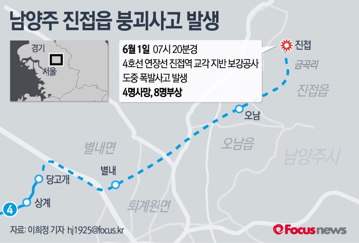 (서울=포커스뉴스) 1일 오전 7시20분께 경기도 남양주시 진접읍 금곡리 진접선 지하철 공사현장이 붕괴해 근로자 4명이 숨지고 8명이 부상했다.