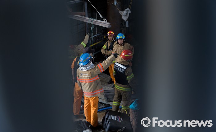 (남양주=포커스뉴스) 1일 오전 7시 20분께 경기 남양주시 진전읍 금곡리 진접석 지하철 공사현장이 붕괴되는 사고가 발생해 소방대원들이 구조작업을 하고 있다.