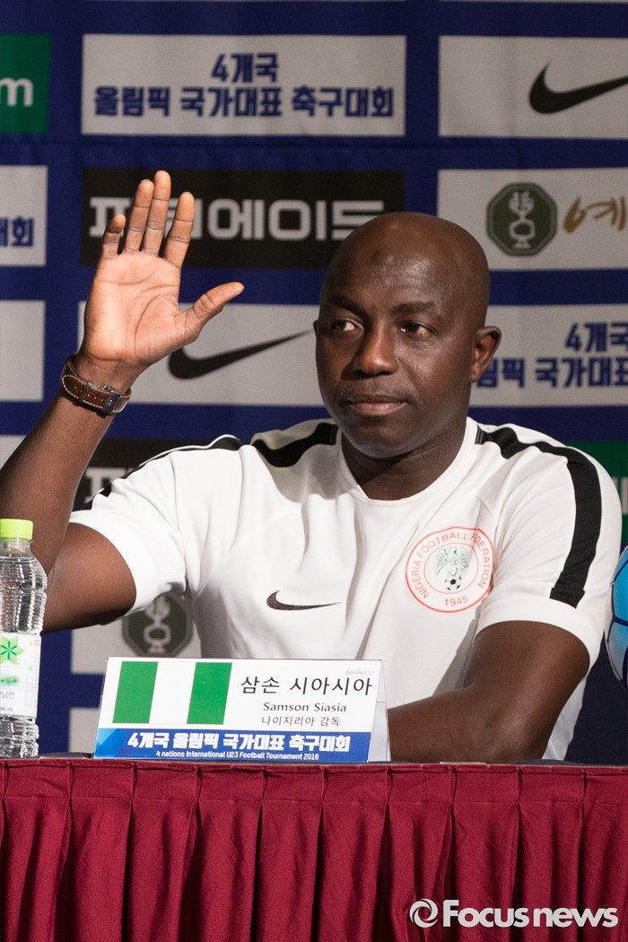 (인천=포커스뉴스) 1일 오전 인천 연수구 라마다송도호텔에서 열린 4개국 올림픽 국가대표 축구대회 공식 기자회견에 참가한 삼손 시아시아 나이지리아 감독이 인사를 하고 있다.