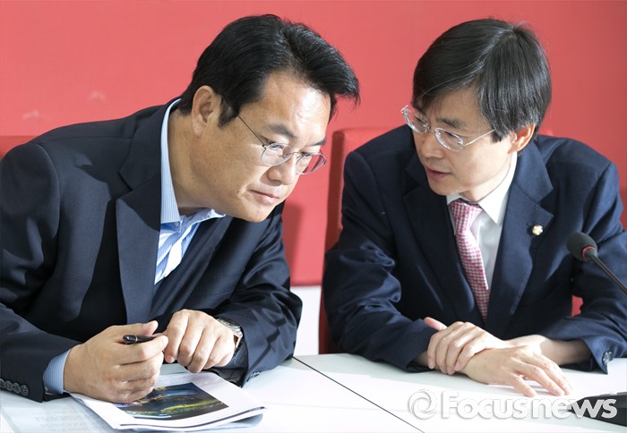 (서울=포커스뉴스) 정진석(왼쪽) 새누리당 원내대표가 1일 오전 서울 여의도 국회에서 열린 김해공항가덕이전시민추진단과의 면담에 참석해 조경태 의원과 대화하고 있다.