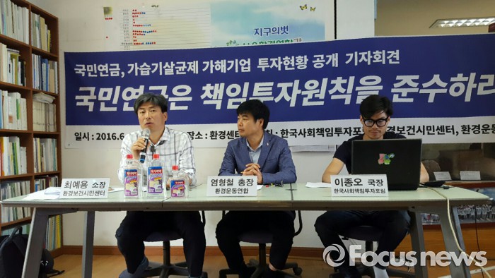 환경운동연합과 환경보건시민센터, 한국사회책임투자포럼 등은 1일 오전 서울 종로구 환경운동연합 건물에서 기자회견을 열고 "국민연금이 투자한 기업 중 가습기살균제 사고를 일으킨 가해기업이 다수 포함돼 있다"고 밝혔다.