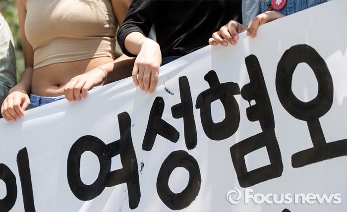 (서울=포커스뉴스) 1일 오전 서울 중구 프레스센터 앞에서 '언론의 여성혐오 조장 보도실태'에 반대하는 20대 여성들이 '우리는 기자회견女다' 기자회견을 갖고 있다.