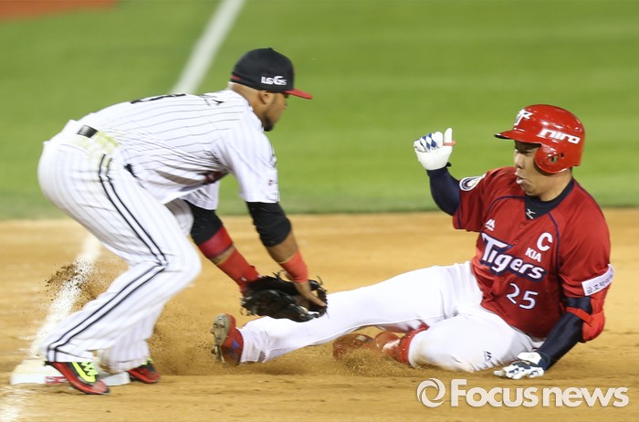 (서울=포커스뉴스) 1일 서울 잠실구장에서 열린 2016 프로야구 KIA-LG 경기 8회초 1사 1루에서 KIA 이범호가 중견수를 넘기는 1타점 2루타를 치고 3루까지 뛰다 아웃되고 있다.