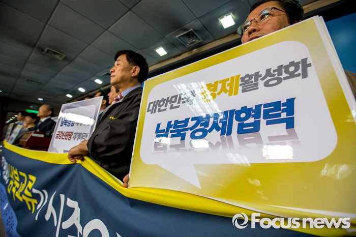 (서울=포커스뉴스) 2일 오후 서울 여의도 국회에서 열린 '남북경협기업 생존대책마련 촉구 기자회견'에 참석한 남북경협기업비상대책위원회 관계자들이 정부에 개성공단 재개 및 금강산 관광 재개 등을 촉구 하고 있다.