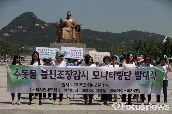 (서울=포커스뉴스) 2일 오전 서울 종로구 광화문 광장에서 수돗물 시민네트워크 관계자들이 수돗물 불신조장감시센터 방송 모니터링단 발대식을 열고 있다.
