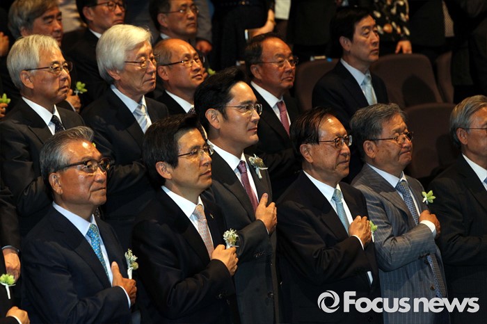 (서울=포커스뉴스) 1일 오후 서울 중구 호암아트홀에서 열린 제26회 호암상 시상식에 참석한 황교안(앞줄 왼쪽 두번째부터) 국무총리와 이재용 삼성전자 부회장이 국민의례를 하고 있다.