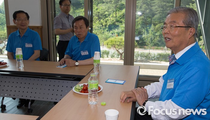 (괴산=포커스뉴스) 김종인 더불어민주당 비대위 대표가 1일 오후 충북 괴산 성불산자연휴양림에서 열린 충북도당 핵심당직자 워크숍에 참석, 총선 출마자 간담회에서 대화를 하고 있다.