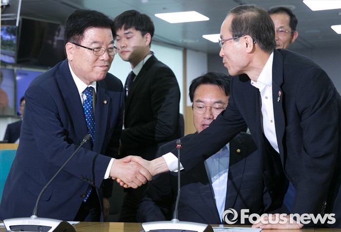 (서울=포커스뉴스) 미세먼지 대책과 관련해 현장 방문에 나선 정진석(가운데) 새누리당 원내대표, 김광림(왼쪽) 정책위의장이 1일 오후 서울 동작구 기상청 종합상황실을 방문해 윤성규 환경부 장관과 인사하고 있다.