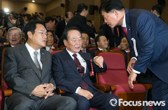 (서울=포커스뉴스) 2일 오후 서울 여의도 국회 의원회관에서 열린 새누리당 4차 전국위원회에 참석한 정진석(왼쪽부터) 원내대표와 서청원 전 최고위원, 김명연 원내대변인이 대화하고 있다.