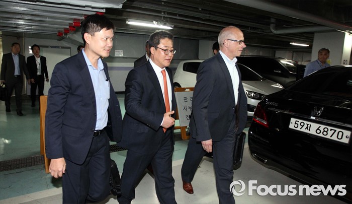(서울=포커스뉴스) 2일 오후 서울 종로구 현대상선 본사에서 열린'G6' 해운동맹 회원사 협렵방안 회의에 참석한 제3 글로벌 해운동맹 디 얼라이언스 소속 해외 선사 관계자들이 회의를 마친 뒤 주차장으로 향하고 있다.