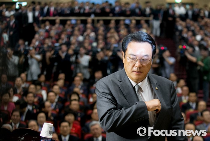 (서울=포커스뉴스) 2일 오후 서울 여의도 국회 의원회관에서 열린 새누리당 4차 전국위원회에 참석한 정진석 원내대표가 인사말을 위해 단상을 오르고 있다.