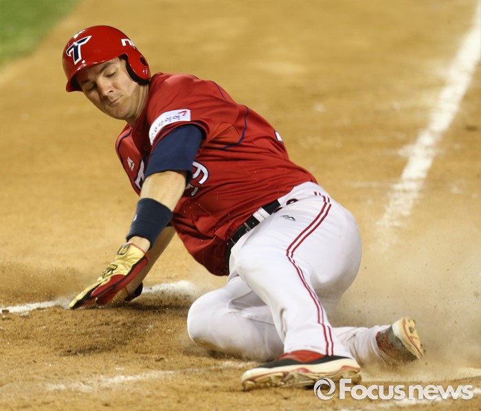 (서울=포커스뉴스) 1일 서울 잠실구장에서 열린 2016 프로야구 KIA-LG 경기 8회초 1사 1루에서 KIA 이범호의 중견수를 넘기는 2루타때 1루주자 필이 홈에 뛰어들어 세이프되고 있다.