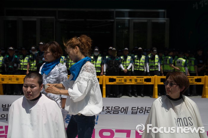 (서울=포커스뉴스) 2일 오후 서울 중구 서울시청 정문 앞에서 장애인부모연대원들이 발달장애인 정책수립을 촉구하며 삭발식을 하고 있다.