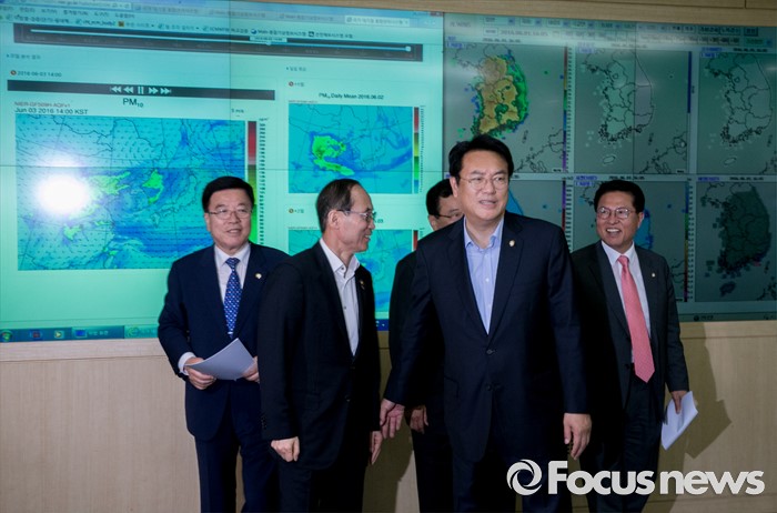 (서울=포커스뉴스) 미세먼지 대책과 관련해 현장 방문에 나선 정진석 새누리당 원내대표과 의원들이 1일 오후 서울 동작구 기상청 종합상황실을 방문해 현황을 살펴본 뒤 이동하고 있다. 왼쪽부터 김광림 정책위의장, 윤성규 환경부 장관, 정 원내대표, 정운천 의원.
