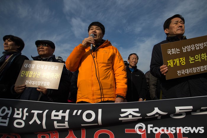 이날 이들은 남양유업 측에 △대국민 사과 및 공익기금 조성 △갑을관계 개선 의지 표명 △시장 지배력 남용 금지 등을 요구할 것을 결의했다.전국대리점연합회 등 단체가 2일 서울 중구 남양유업 본사 앞에서 기자회견을 열고 남양유업 측을 비판했다. 사진은 지난해 12월 서울 여의도 국회 앞에서 열린 '남양유업방지법' 재개정 촉구 기자회견 당시의 모습. 2015.12.09 성동훈 기자