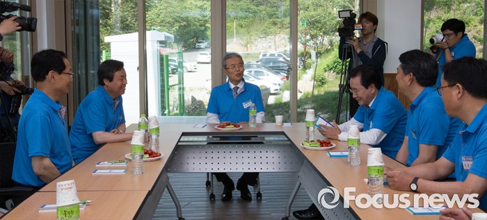 (괴산=포커스뉴스) 김종인 더불어민주당 비대위 대표가 1일 오후 충북 괴산 성불산자연휴양림에서 열린 충북도당 핵심당직자 워크숍에 참석, 총선 출마자 간담회에서 대화를 하고 있다.