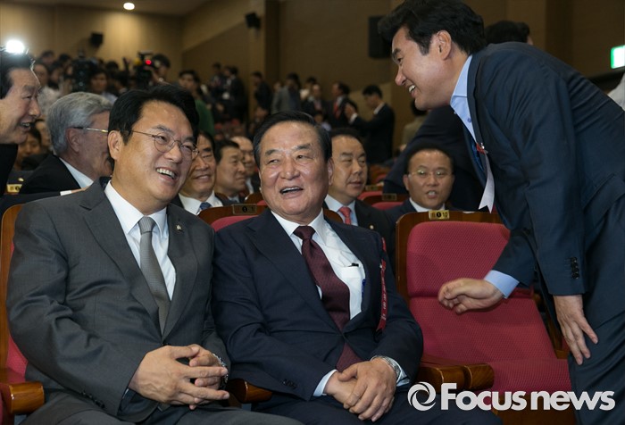 (서울=포커스뉴스) 2일 오후 서울 여의도 국회 의원회관에서 열린 새누리당 4차 전국위원회에 참석한 정진석(왼쪽부터) 원내대표와 서청원 전 최고위원, 원유철 전 원내대표가 대화하고 있다.