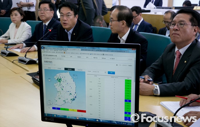 (서울=포커스뉴스) 미세먼지 대책과 관련해 현장 방문에 나선 정진석(오른쪽 세번째) 새누리당 원내대표가 1일 오후 서울 동작구 기상청 종합상황실을 방문해 모두발언을 하고 있다.