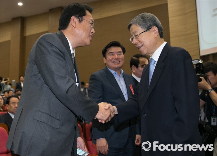 (서울=포커스뉴스) 2일 오후 서울 여의도 국회 의원회관에서 열린 새누리당 4차 전국위원회에 참석한 정진석(왼쪽) 원내대표와 공식 선출된 김희옥 혁신비대위원장이 악수하고 있다.