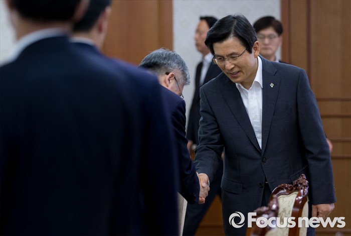 (서울=포커스뉴스) 황교안 국무총리가 2일 오전 서울 종로구 정부서울청사에서 국가정책조정회의를 주재하며 인사를 나누고 있다.